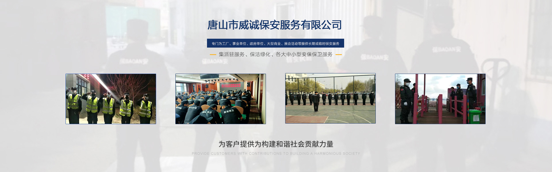 唐山市威誠保安服務(wù)有限公司自成立以來以“嚴(yán)防死守、忠于業(yè)主”為服務(wù)原則,以“客戶滿意、 合作共贏”為根本目標(biāo)。以科學(xué)的管理、多方位多層次的服務(wù),建立了首問責(zé)任制,完善了走訪、回訪 、滿意度調(diào)查、末位淘汰的預(yù)警管理,不斷提高服務(wù)質(zhì)量,提高業(yè)主滿意度,提高企業(yè)形象。秉承“誠 實守信,紀(jì)律嚴(yán)明,團結(jié)協(xié)作,致精致誠”的服務(wù)理念,為客戶提供高品質(zhì)、多方位、專業(yè)化的保安服務(wù)。 本公司制定了嚴(yán)謹(jǐn)?shù)亩ㄏ蛘猩?、崗前培?xùn)、考核錄用、崗中培訓(xùn)、持續(xù)培訓(xùn)、末位淘汰制等一整套完善的管理體系??梢愿鶕?jù)客戶的要求實地勘察評估,以量身定做的方式提供安保防范服務(wù)。